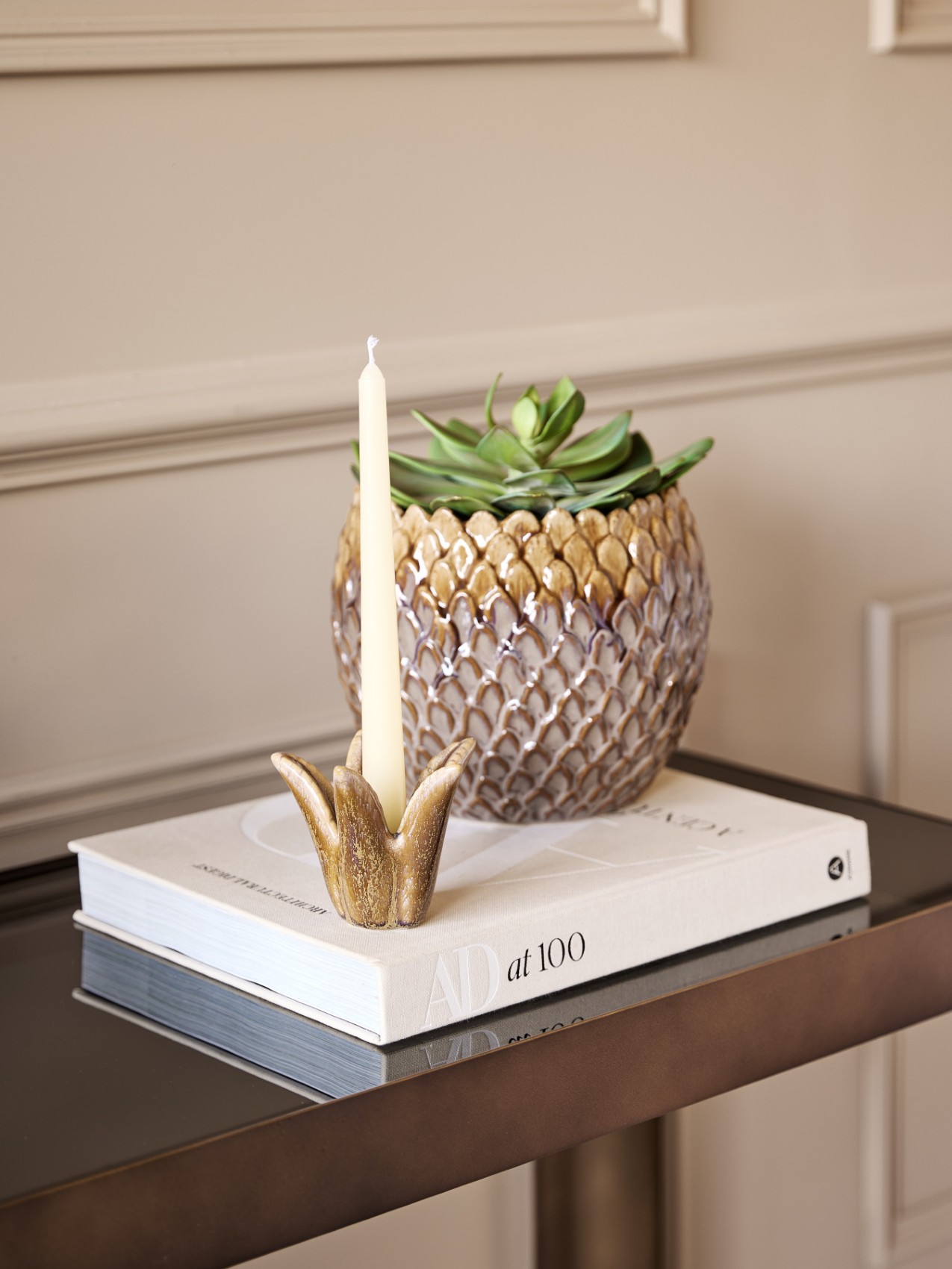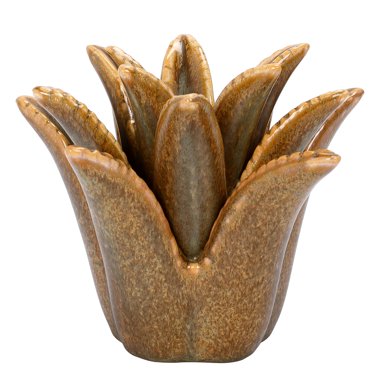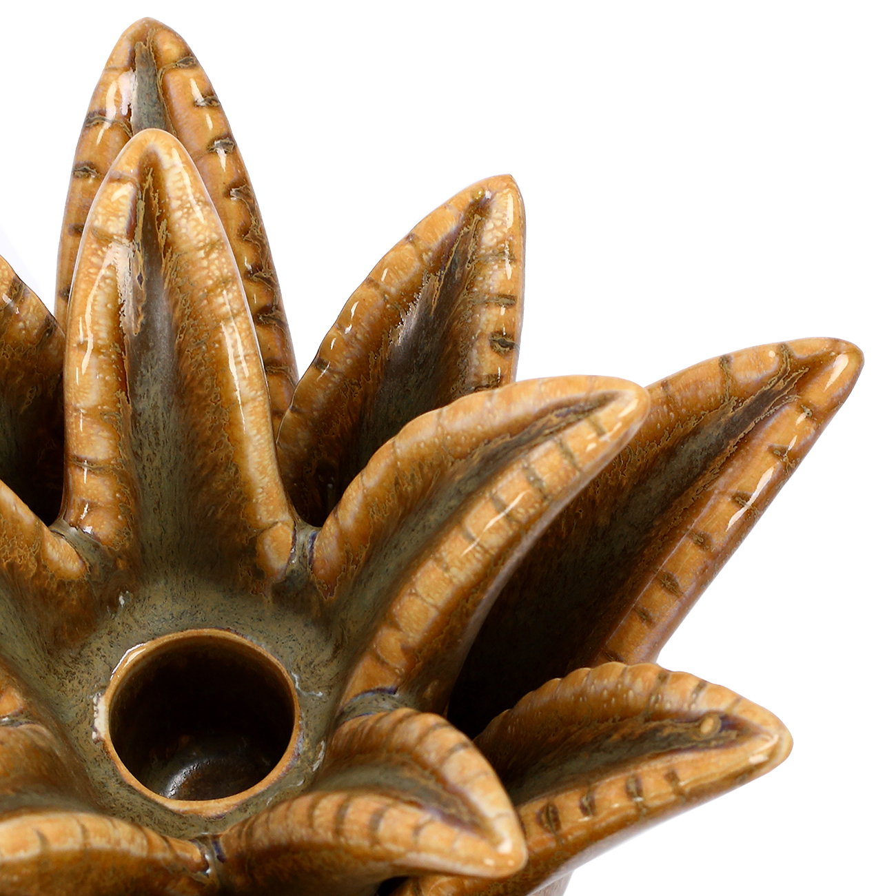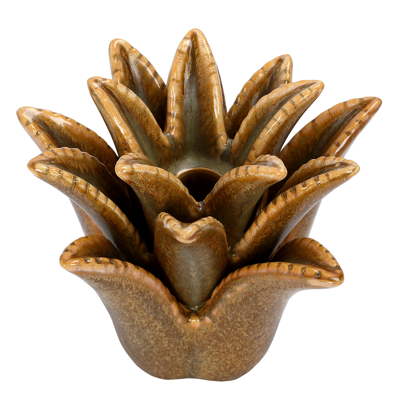 With its larger scale and graceful, crown-like silhouette, the Tropic Reactive Glaze Medium Candle Holder makes a sculptural statement. Each petal is individually defined by the reactive glaze, creating a natural variation that highlights its artisanal quality. Ideal for a dinner candle, this piece works beautifully styled alone or layered with the Small Candle Holder. For a curated finish, style it with the Tropic Reactive Glaze Pineapple from the same collection. Dimensions: W17 x D16 x H13 cm.
