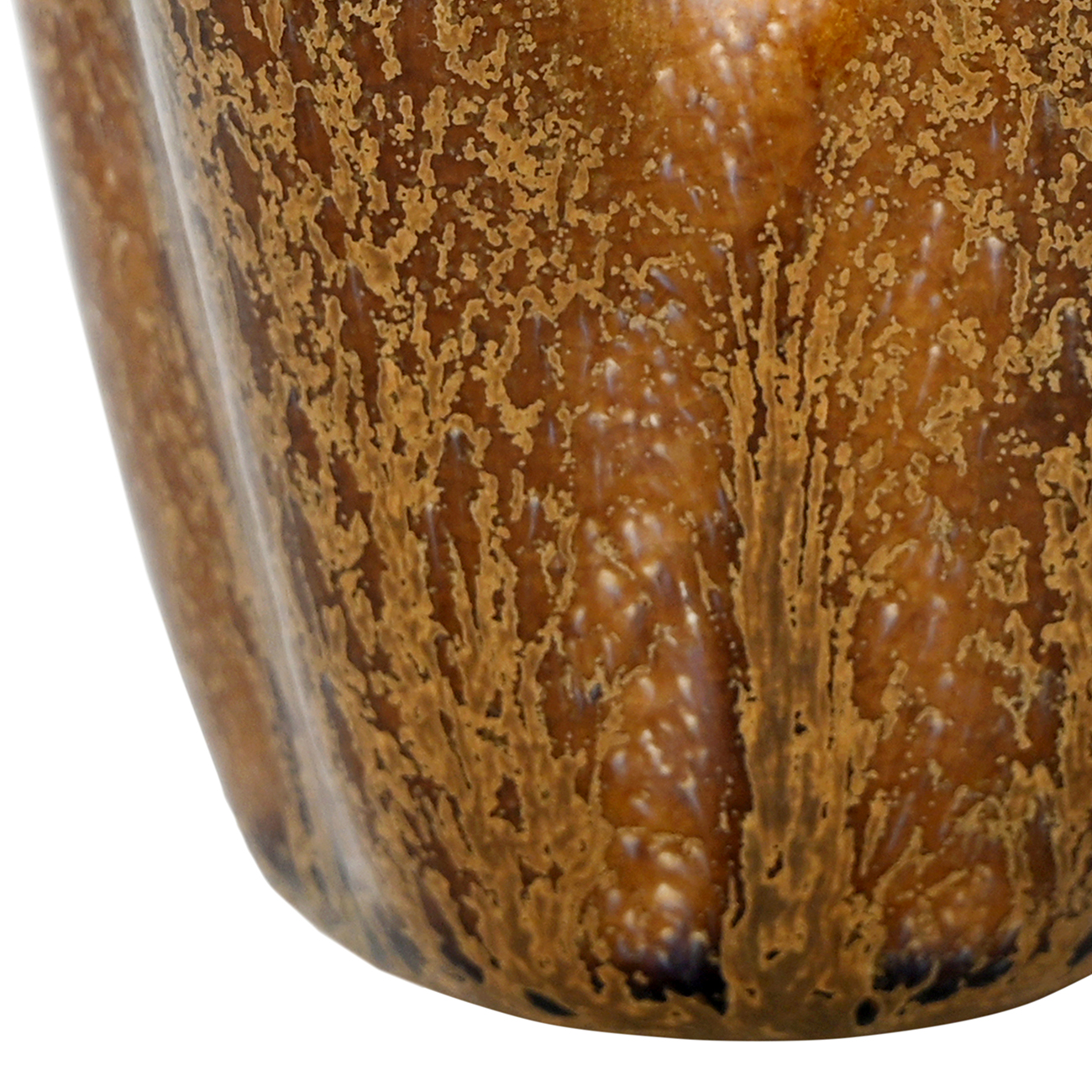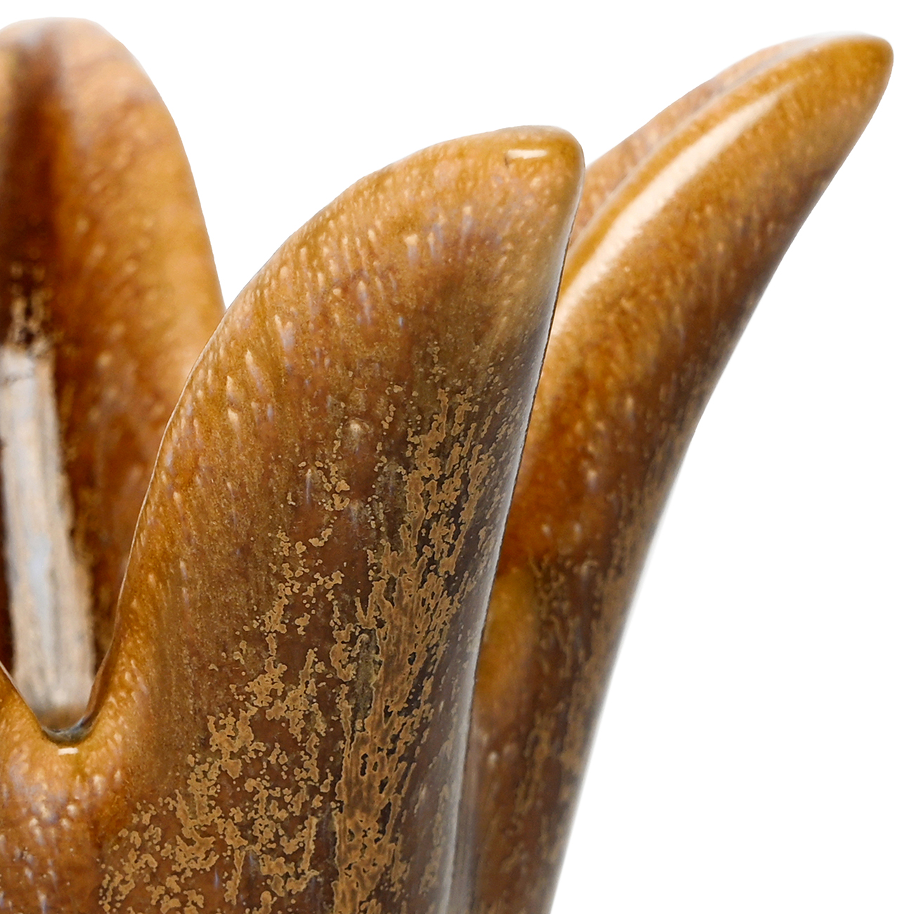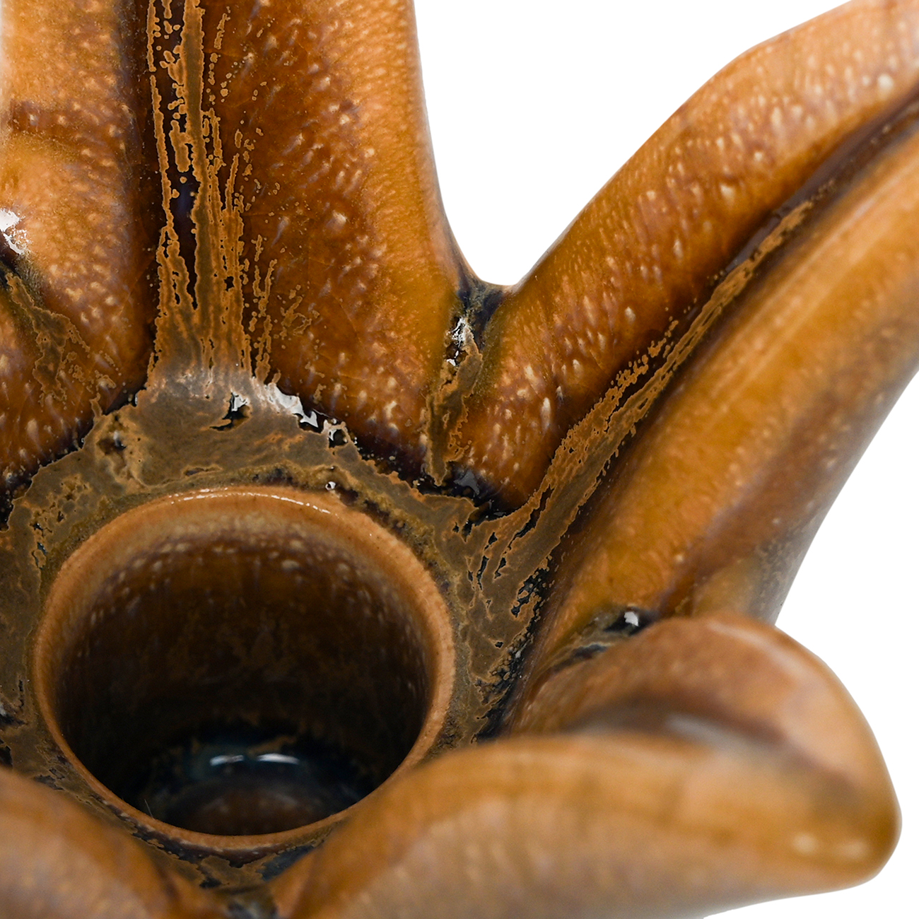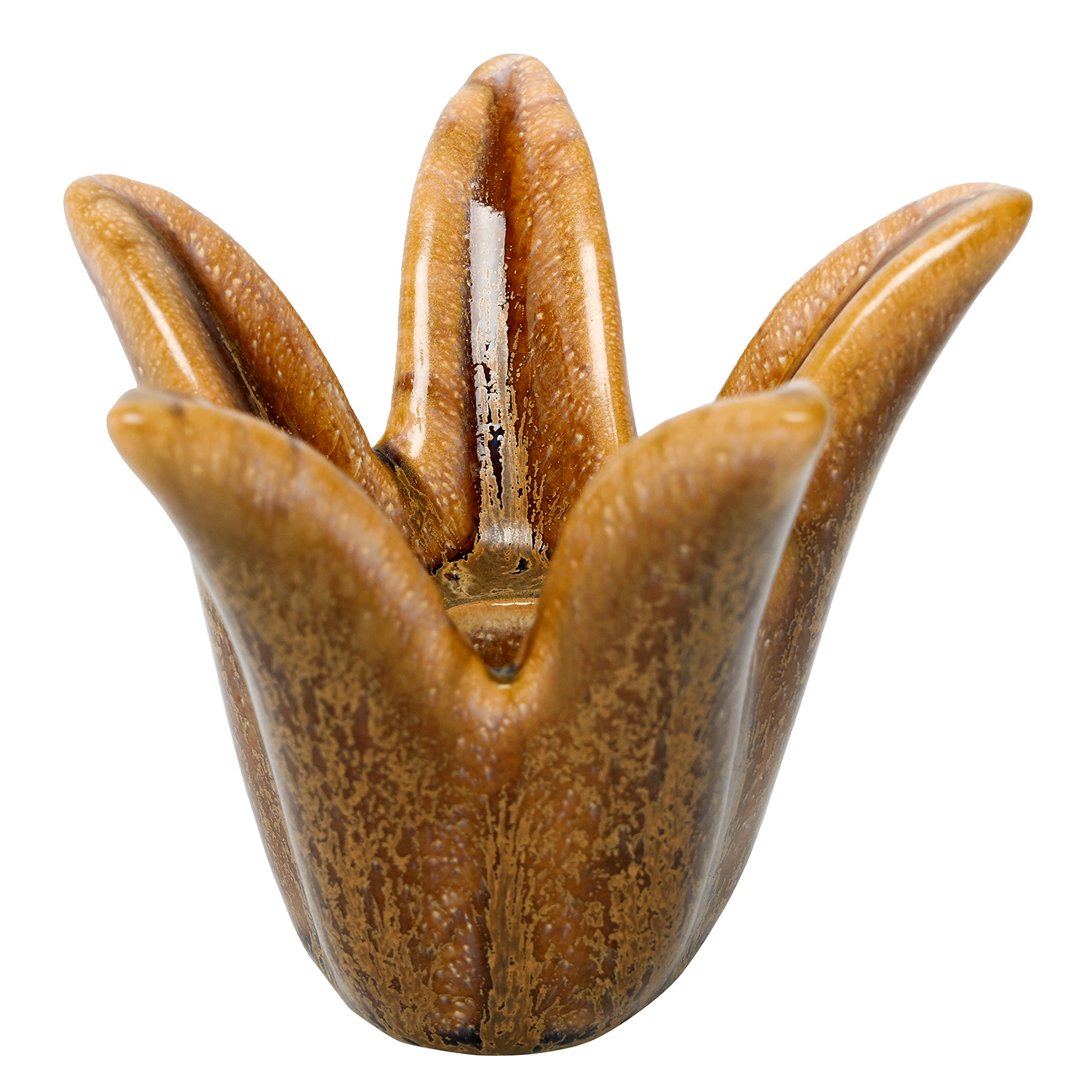 Inspired by the unfurling elegance of a tropical bloom, the Tropic Reactive Glaze Small Candle Holder brings sculptural charm and warmth to any setting. The richly reactive glaze draws out the organic ridges of each petal in earthy tones, giving the piece a beautifully handcrafted finish. Perfect styled solo or grouped for layered impact, this piece is designed to hold a standard dinner candle. Pair it with the coordinating Medium Candle Holder or the Tropic Reactive Glaze Pineapple for a cohesive, tonal display. Dimensions: W9.8 x D9.5 x H8.3 cm.